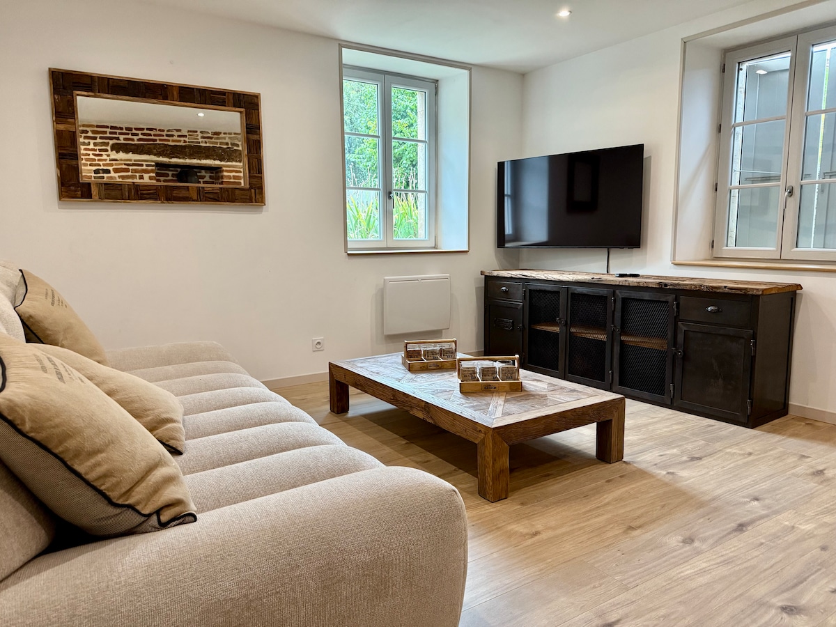 Casa de campo com prado e lago onde os animais podem ficar com você. A acomodação de 62 m² é composta por um quarto (1 cama de casal, 1 beliche para crianças), uma sala de estar com sofá-cama, mesa de jantar para 4 ou 6 pessoas, uma cozinha equipada, um banheiro com chuveiro italiano, banheiro separado e 2 terraços de madeira. Você terá televisão à sua disposição. A roupa de cama é fornecida. Estacionamento privativo em frente à casa.