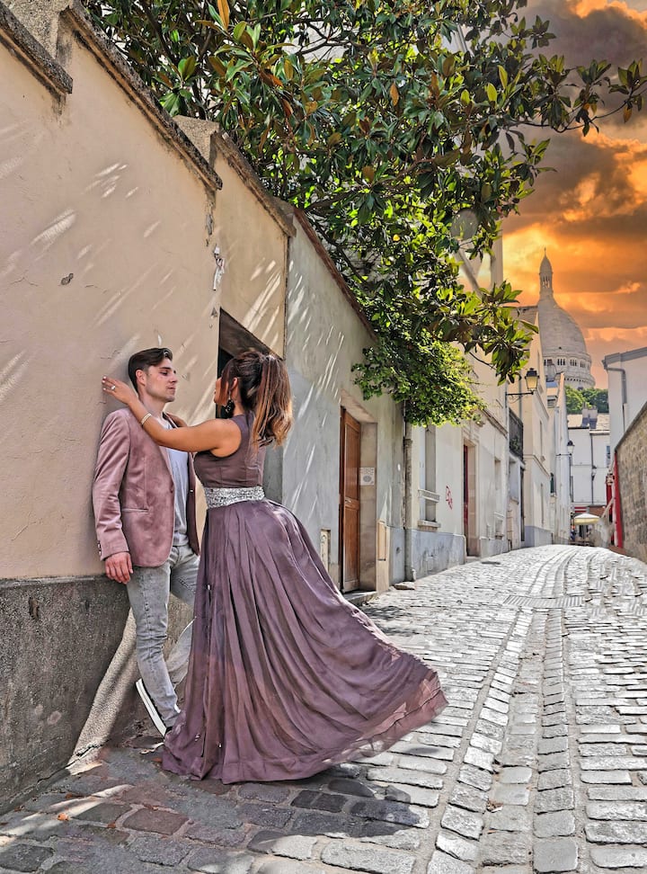 Sessão fotográfica romântica privada em Montmartre, o belo bairro artístico onde Picasso viveu e onde Emily in Paris foi filmada. Inclui também uma visita cultural.