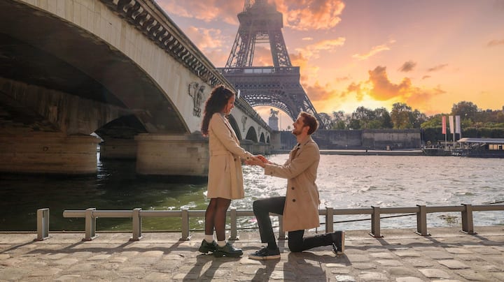 Sessão fotográfica romântica na icónica Torre Eiffel e no rio Sena.