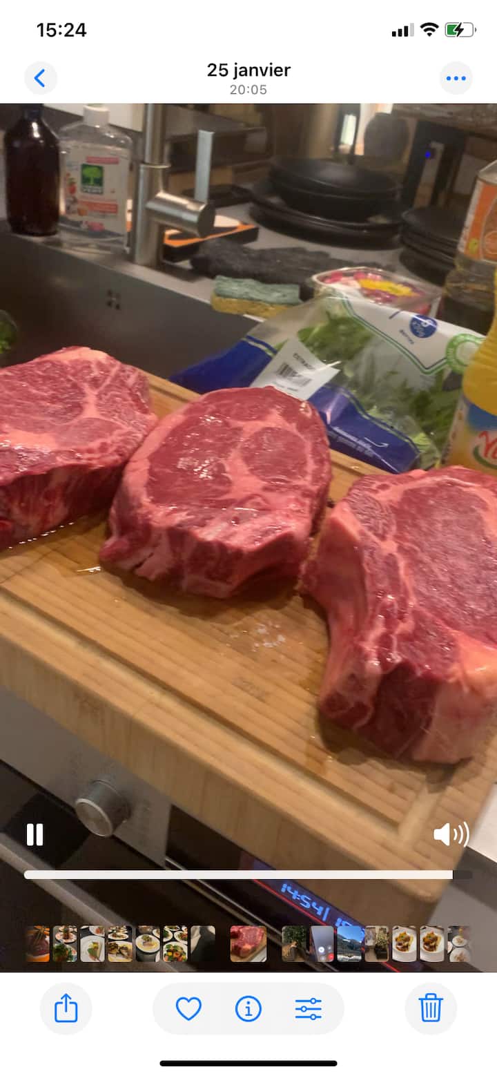 Seleção de carnes excepcionais, como costela de boi maturada, filé de boi simmental, cordeiro dos Adrets e aves de Bresse.