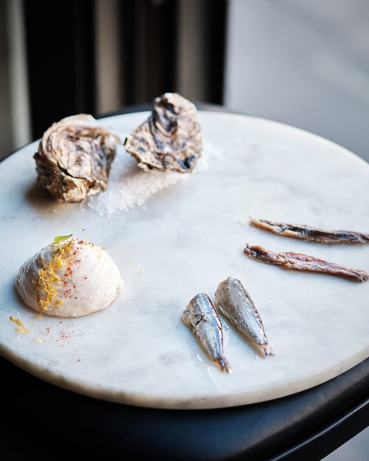 Esta seleção de petiscos sazonais para partilhar oferece produtos como tarama de trufas, húmus, mezze, uma frigideira de facas de limão cristalizado, ostras com molho de geleia de pimentão, sardinhas vintage, bem como charcutarias e queijos cuidadosamente escolhidos.