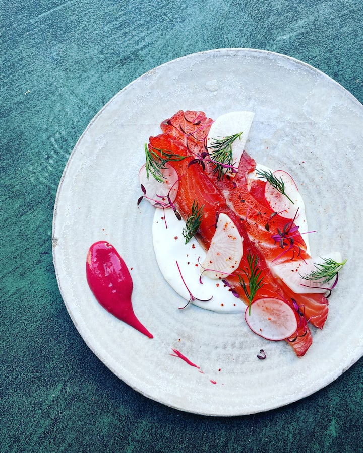 Esta viagem culinária entre o Mediterrâneo e o Japão inclui um aperitivo, uma entrada e um prato. Água de pepino, rabanete daikon, abobrinha e óleo de capucine, gravlax de salmão e gin, risotto, polvo grelhado, 'nduja, limão confitado e óleo de endro são as múltiplas facetas deste belo menu colorido.