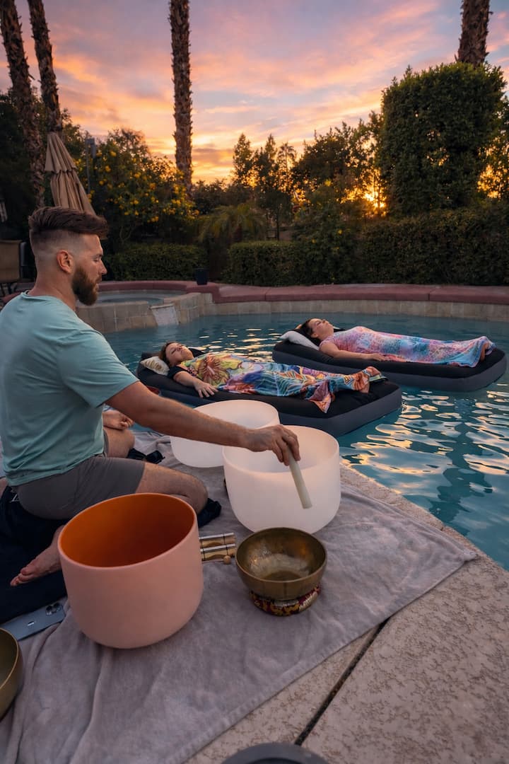 Esta sessão profundamente conectiva é melhor apreciada ao pôr do sol. Flutue suavemente na piscina enquanto a meditação guiada, os exercícios de respiração e a aromaterapia convidam o corpo a um descanso profundo. Tigelas de canto de cristal, tigelas tibetanas, tambores, tambores oceânicos, gongos, paus de chuva, sinos e muito mais o rodeiam enquanto as vibrações sonoras viajam através da água, amplificando o seu efeito calmante.