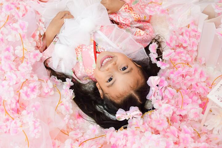 Sessão fotográfica para bebés e crianças com quimono, em inglês. Desfrute de belas fotografias com tema de sakura durante todo o ano. As sessões em estúdio interior são seguras e protegidas das intempéries para as famílias que viajam pelo Japão.