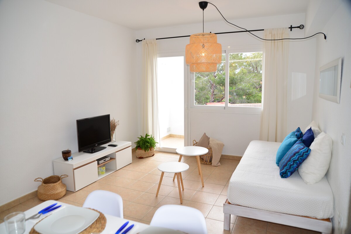 El apartamento dispone de habitación con cama doble, baño con ducha, cocina abierta con barra americana, y una terrazita cubierta que da al jardín. La habitación esta compuesta con una cama de 135 cm por 190cm, armario, smart TV de 24” El salón cocina tiene una mesa para comer con sillas. La cocina abierta con barra americana encontraras, nevera, microondas, cafetera moka italiana, tostador, la vajilla y cubertería necesaria para unas comidas sencillas.
