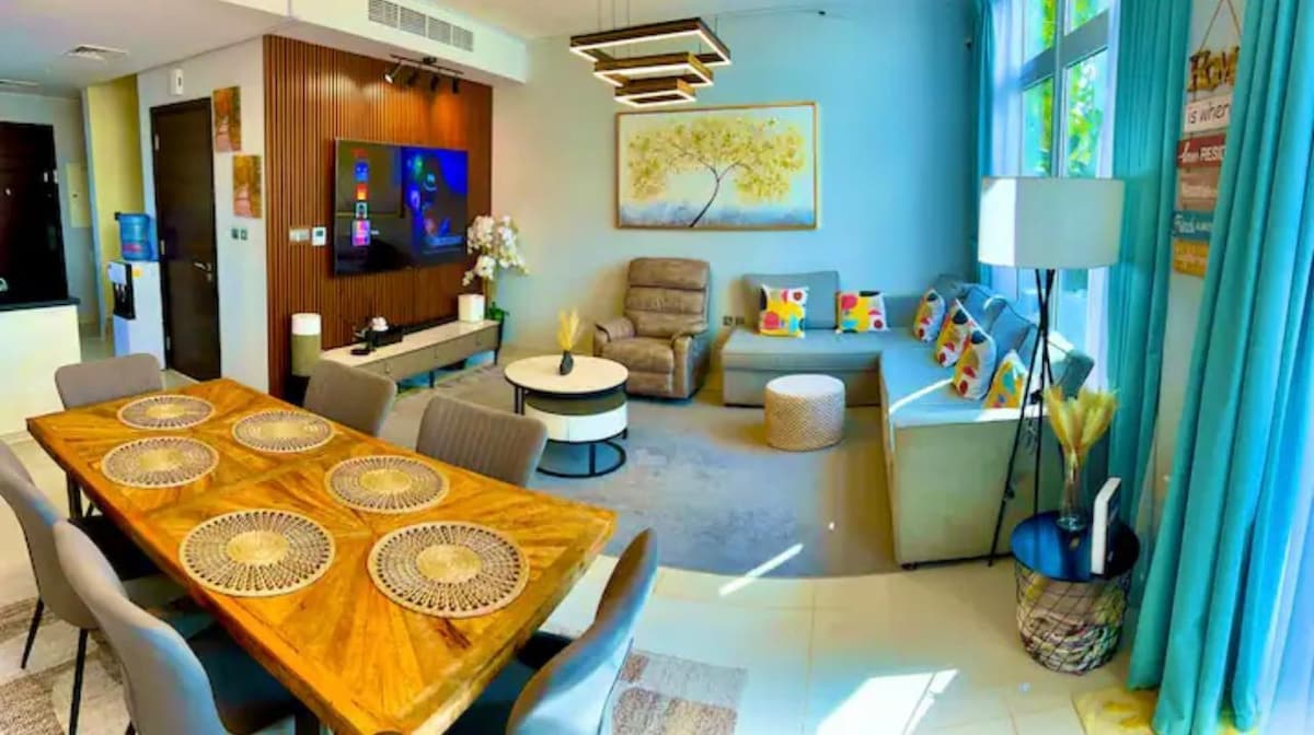 This elegant two floors villa in Dubai offers a perfect blend of modern luxury and desert tranquility. Spacious interior and stylish design, this villa ensures large room for relaxation and entertainment, making it a family-friendly retreat in the heart of Dubai desert. Sorry, but No Parties allowed! This Villa in Damac Hills 2 ( Vardon) is convenient located near the newly opened Water Town, Dubai Sport City, Dubai Autodrome, Dubai Miracle Garden, Outlet Mall, many more attractions.