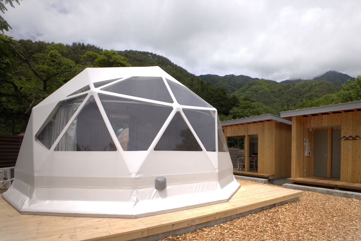 Espaço privado em meio à natureza, limitado a três grupos por dia É uma acomodação do tipo casa-trailer que utiliza terrenos não utilizados nos Alpes do Sul. Ao conectar as duas casas-trailer (a que abriga o quarto e a que abriga o banho ao ar livre) com um deck de madeira, foi possível conciliar a privacidade com a sensação de abertura. Desfrute de um momento especial que só você pode vivenciar em um local com vista para as montanhas de Yamanashi, incluindo o Monte Fuji, e para a Bacia de Kofu. As refeições e bebidas são preparadas com ingredientes da província de Yamanashi. A paisagem que muda com o passar do tempo e das estações espera por você.