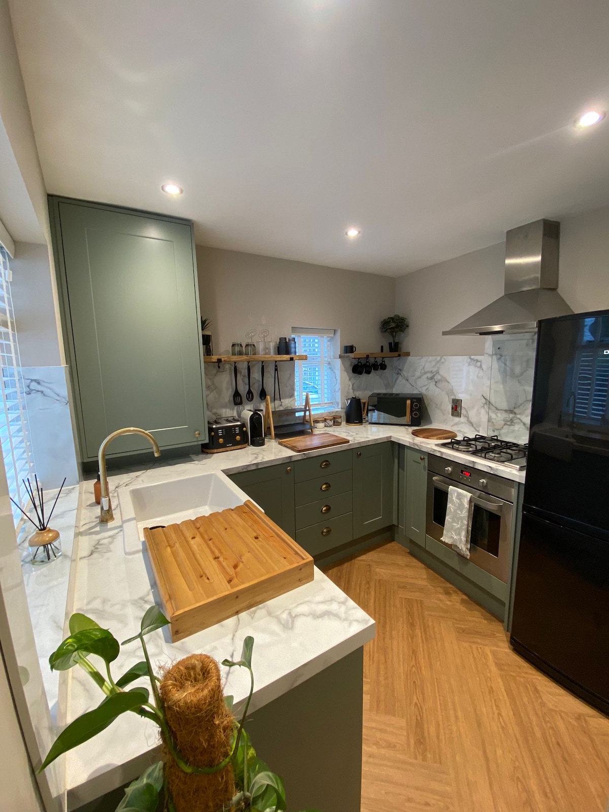 Localização central, lindamente apresentado apartamento king-size 1 cama. Dois minutos a pé da estação de trem/ônibus e cinco minutos de restaurantes e lojas. Estacionamento gratuito. Bela área de estar em plano aberto. Cozinha totalmente equipada com equipamentos de cozinha novos, especiarias, ervas, Nutribullet, espremedor e coqueteleira! Chá, café e cafeteira fornecidos. Sofá grande e TV Fire Stick. Wi-Fi ✨super rápido✨ Quarto ✨King Size e TV✨ ✨Banheira e chuveiro✨ Limpeza profissional para o programa 'Comprometido com a limpeza' do Airbnb. Acesso via cofre de chaves