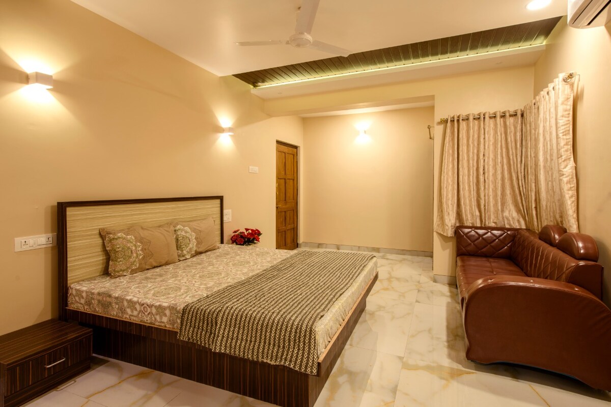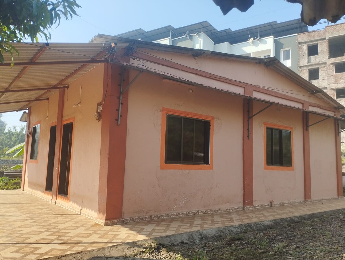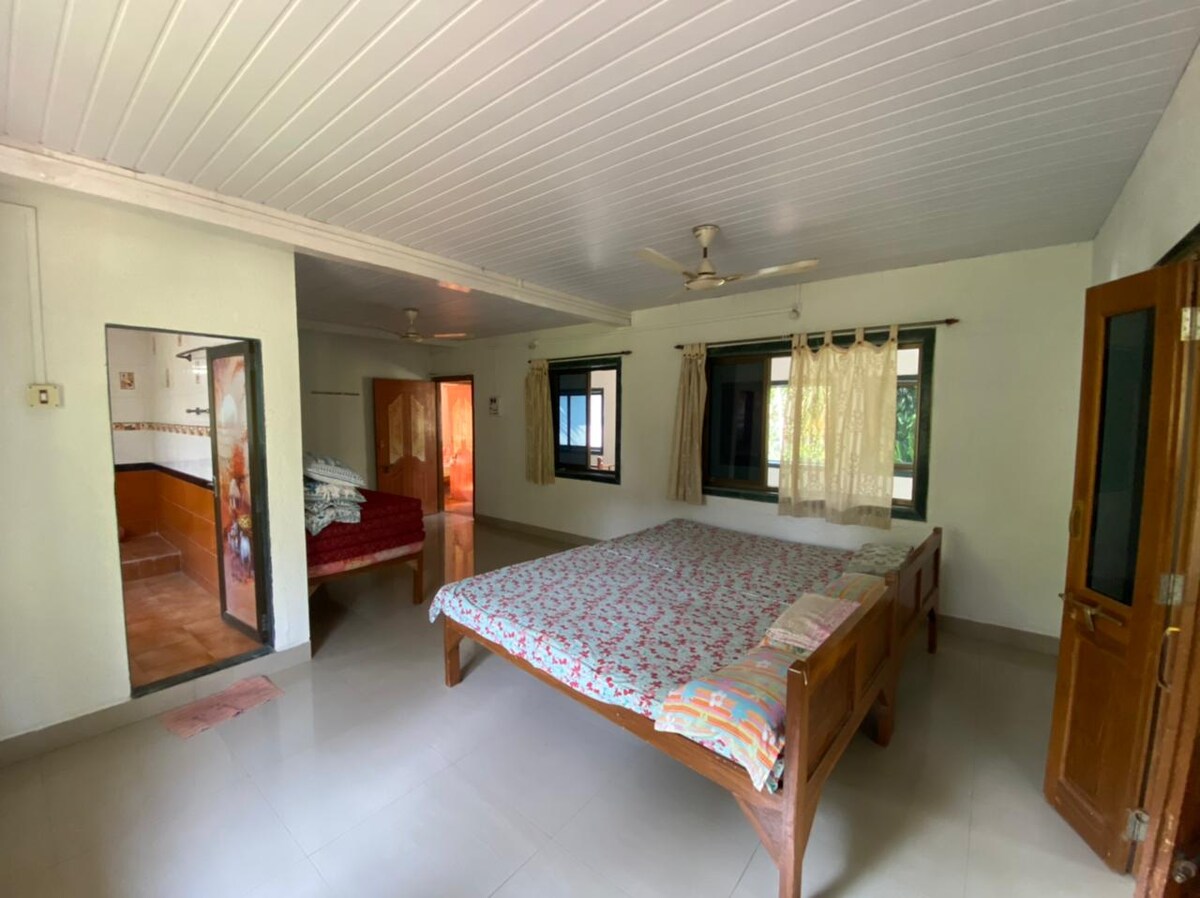 * Families preferred. No smoking or drinking. * Escape to our cozy, pet-friendly homestay in Shrivardhan, just a few minutes from the beach. The space is most comfortable for 4 guests due to a single bathroom, but we can accommodate up to 6 adults. Enjoy air-conditioning, inverter backup, TV and Wi-Fi for a comfortable and convenient stay. While we don’t offer food or silverware, our neighbours prepare tasty Konkani vegetarian and non-veg meals, which will be served in our backyard.