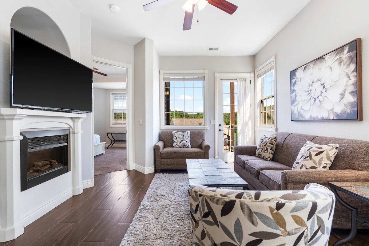 Um apartamento alegre, sem escadas, com 2 quartos e 2 casas de banho, que combina conforto e charme com toques de personalidade. Relaxe no espaçoso deck privado ou desfrute da piscina e da banheira de hidromassagem (sazonal - normalmente aberta do Memorial Day ao Dia do Trabalho - por favor, pergunte as datas exatas), trilhos naturais e Silver Dollar City. Cozinha totalmente abastecida, área de estar confortável e todos os toques atenciosos que fazem desta uma base acolhedora e conveniente para a sua escapadela em Branson.