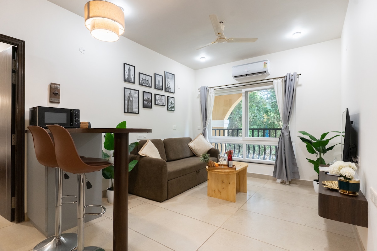 Welcome to my cosy holiday home. Nestled amidst countless coconut trees, the Goa vibes are on point here. This 1bhk is perfect for up to 3 people & has everything you need. Wi-Fi, a well stocked kitchen, spacious balcony and living room, a smart tv, good views, & of course, good vibes! You can take a relaxing dip in the pool, workout in the gym, or hop over to sweet lil Uddo beach for sunset and kayaking. Central yet peaceful location in a beautiful gated society.