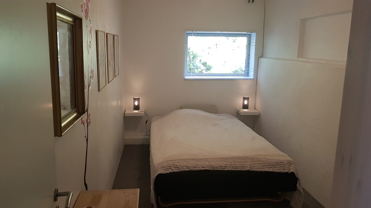 Lille anneks som ligger i haven. Der er et badeværelse, en hems og stue med et lille te-køkken. Køkkenet indeholder kogeplader og kombiovn, samt kaffemaskine. Hemsen har en skøn udsigt, særlig om aftenen hvor der kan kigges på smukke solnedgange og stjerner. Der er 2 madrasser på hemsen, og mulighed for en tredje. Der er en sovesofa i stuen hvor der kan sove to personer. Der er mulighed for at låne luftmadras og rejseseng, skriv blot. OBS der er IKKE wifi dækning.