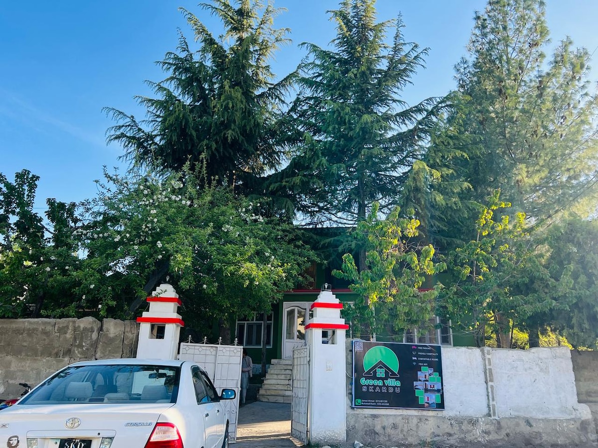 A nossa casa de hóspedes oferece uma vista deslumbrante para o vale abaixo, rodeada por pinheiros, flores coloridas, canto de pássaros e jardim verde. É um refúgio perfeito para os amantes da natureza. A sua família estará perto de tudo quando ficar neste lugar central. O forte de Kharphocho fica a 3 minutos de distância. O mercado principal fica a 1 minuto de distância. O campo de polo fica a 2 minutos. Todos os lugares podem ser vistos a partir da casa localizada no coração da cidade de Skardu num local tranquilo e elevado,