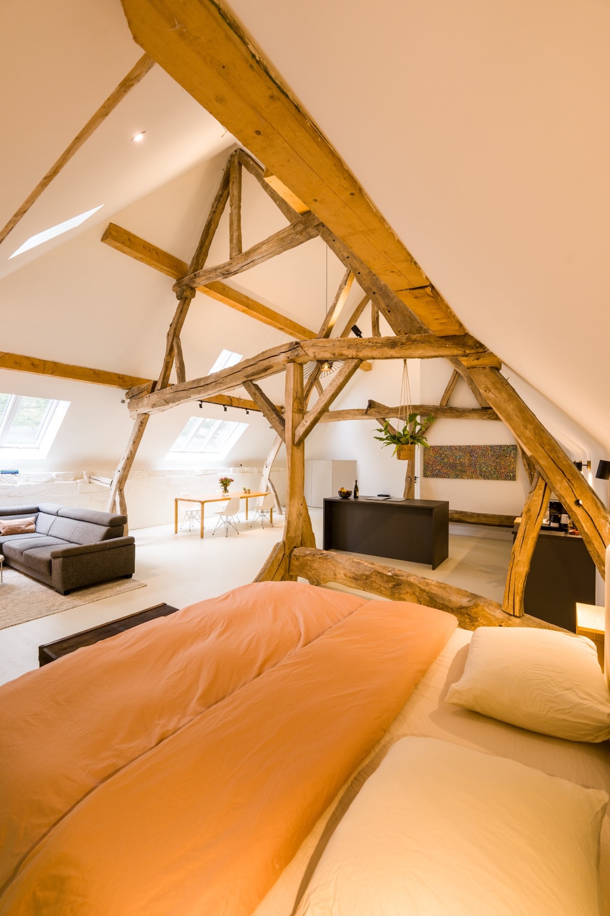Bem-vindo ao Luna Loft! O Loft é um espaço de estar e trabalho luxuoso, muito espaçoso e maravilhosamente renovado, adequado para 4 pessoas. Pode passar as suas férias lá ou trabalhar em paz, mesmo que por um período mais longo de tempo. O loft e a natureza irão ajudá-lo. Onde agora a sala de estar muito espaçosa está localizada, há alguns anos, as bolas de feno e palha e as escadas de madeira de madeira de metros de comprimento foram exibidas contra os carvalhos. O Loft tem 110 m2 e está localizado nos arredores de Bravenvoeren da aldeia.