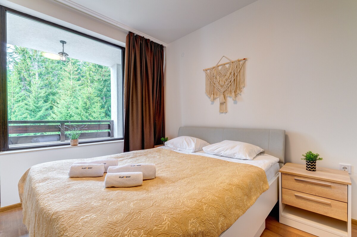 O apartamento tem 1 quarto, 1 casa de banho, uma sala de estar com um sofá-cama, uma cozinha equipada, uma sala de jantar, uma lareira e uma varanda com uma vista maravilhosa. O complexo do Grande Mosteiro é uma cidade inteira. Há estacionamento vigiado, gratuito para os hóspedes. Toda a segurança está a nível profissional. O complexo tem uma grande piscina e spa, bowling , serviço de esqui completo, instrutores de esqui e snowboard, restaurantes, bares, centro de fitness, massagens, supermercado.