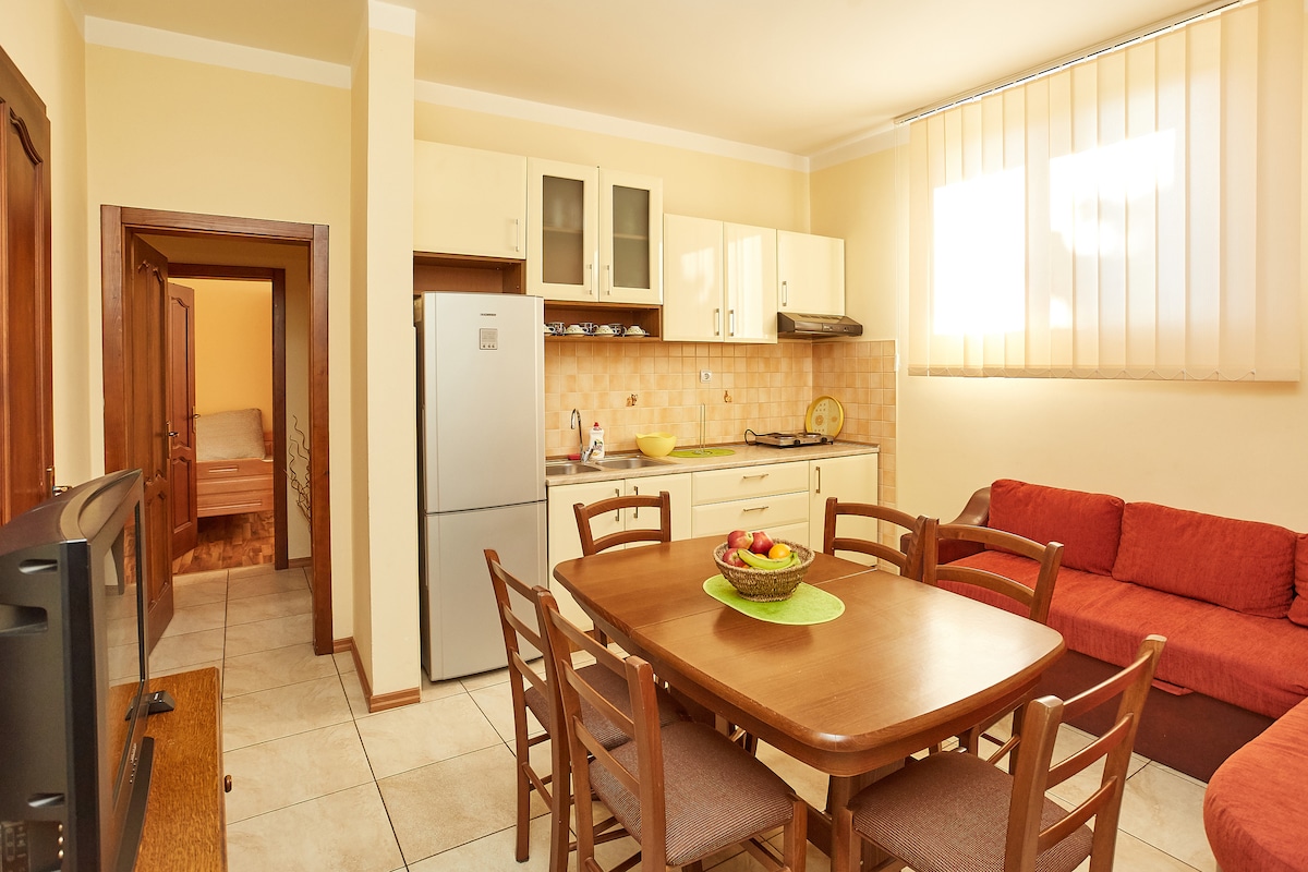 A "Villa Pola" fica perto do centro, mas numa rua tranquila sem trânsito frequente. O Aqua Park fica a cerca de 5 minutos a pé. A casa fica no fundo de um pátio espaçoso, longe da rua, à sombra natural das árvores nos fundos, por isso é ideal para descanso, especialmente adequado para famílias com crianças. O apartamento fica no rés-do-chão, e a casa tem apenas um apartamento,com espaço de estar separado, por isso é possível manter um nível significativo de intimidade. O quintal está cheio de vegetação, com lugares de estacionamento. Dragstor fica a 100 metros de distância.