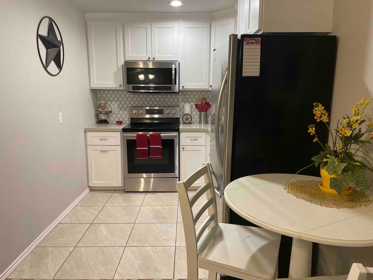 Aproveite o charme vintage deste apartamento duplex totalmente renovado, pisos de madeira antigos recuperados, cozinha, geladeira, fogão/fogão, micro-ondas, 2 TVs inteligentes grandes, sala de estar, cama queen size, banheiro moderno com pia de vaso e tampo de vanidade de calcário, pátio privado e quintal, árvores de algarroba maduras, mesa de jantar, mesa de mesa, a uma quadra de distância da Business 77, restaurantes, lojas, parques, trilhas para caminhadas e ciclismo e o centro de pássaros do parque Ramsey, perto do Valley Baptist Hospital e do Campus Harlingen da UTRGV.