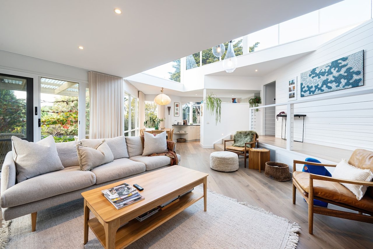 Poet’s Corner House on Phillip Island is a peaceful retreat that blends modern comfort with relaxed coastal charm. With two queen bedrooms, a sunlit loft lounge, and a cozy fireplace, it’s ideal for couples, families, or friends. Prepare meals in the gourmet kitchen or outdoors on the BBQ and pizza oven, then unwind in the garden hammock under the stars. Minutes from Surf Beach, local dining, and the Penguin Parade, it’s a welcoming base to slow down, recharge, and enjoy “Island Time.”