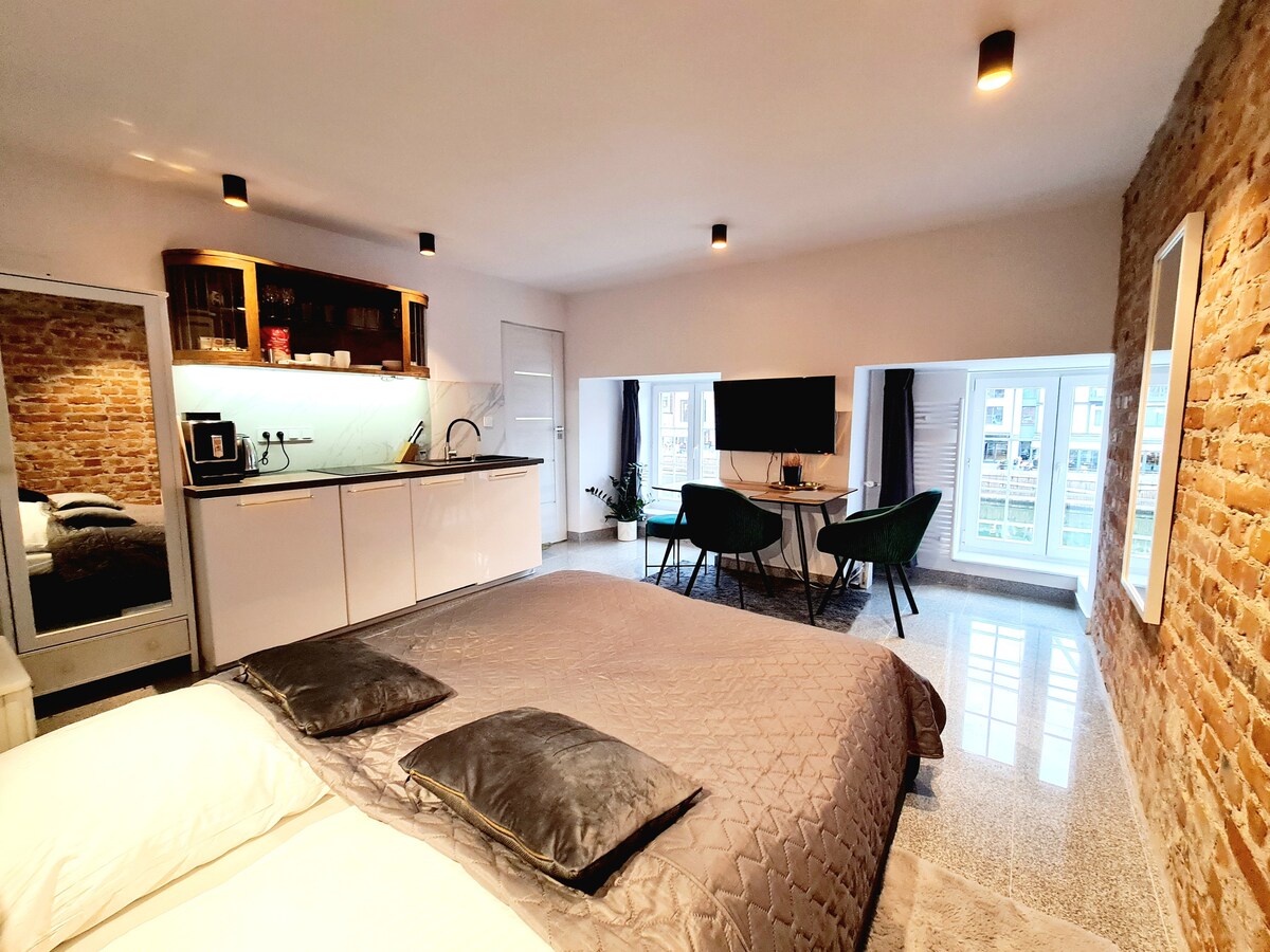 Przestronny i nowocześnie urządzony apartament z widokiem na Motławę.Apartament znajduje się na 1 piętrze historycznego budynku .Doskonała lokalizacja(centrum Starówki)50m do fontanny Neptuna ,5m Motława ,100 m Bazylika Mariacka i kilkanaście restauracji w zasięgu wzroku sprawia,że jest to idealne miejsce do spędzenia czasu w Gdańsku.Apartament składa się z pokoju z aneksem kuchennym wyposażonym we wszystkie potrzebne sprzęty(płyta indukcyjna,zmywarka,lodówka, ekspres ) oraz dużej łazienki.