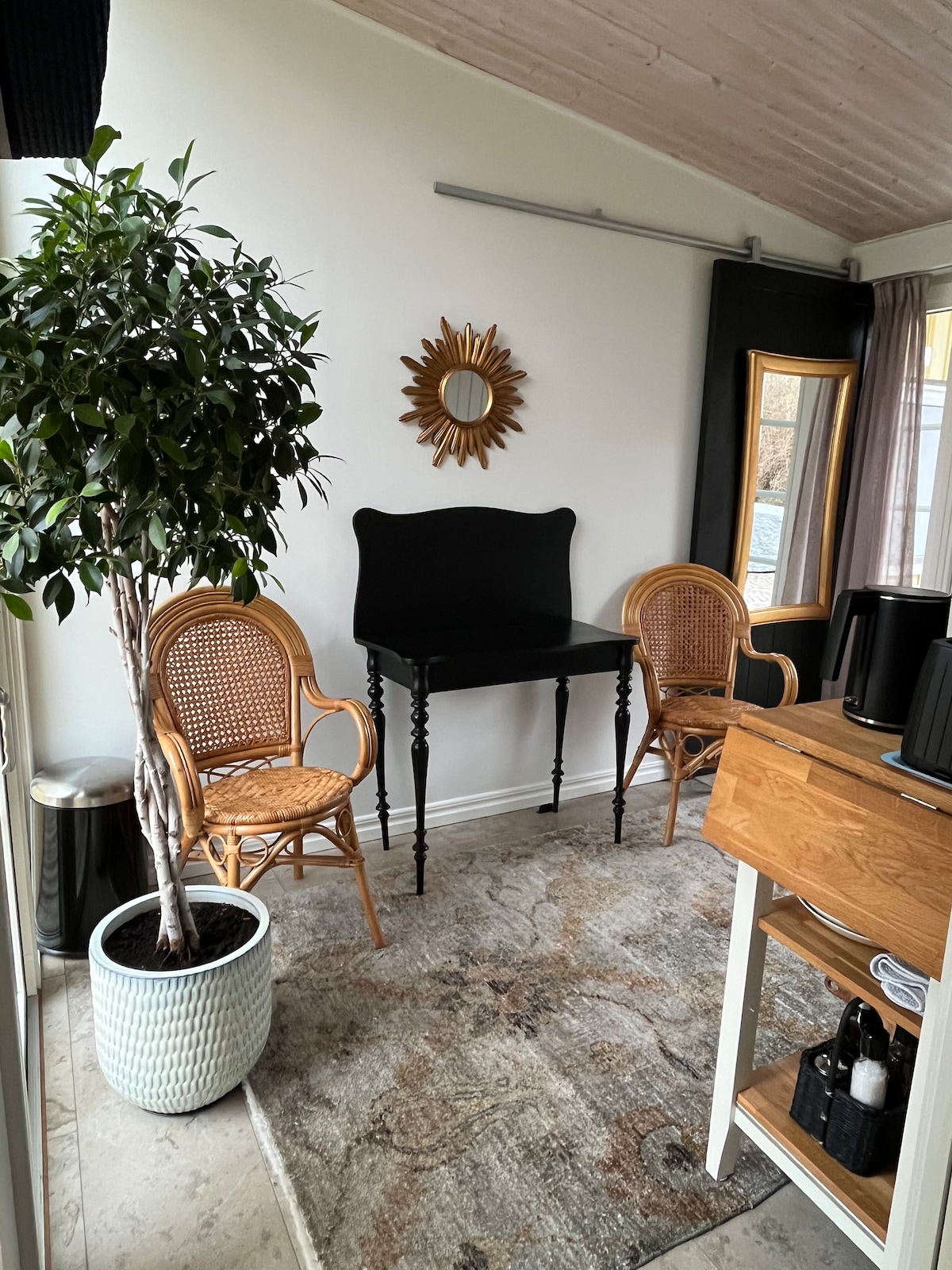 Bem-vindo, Meu nome é Frans, alguns anos atrás eu tive um derrame, então minha fala não é 100%, mas eu entendo holandês, inglês e sueco. A sala de estar, o quarto e o banheiro foram construídos dentro de uma garagem que também é sua (há muito aquecimento). Foi instalada uma pequena cozinha que tem um fogão, torradeira, chaleira, geladeira, micro-ondas e, claro, seus utilitários básicos.(Há uma panela elétrica também). Se precisar de mais algum equipamento de cozinha, é só pedir :)