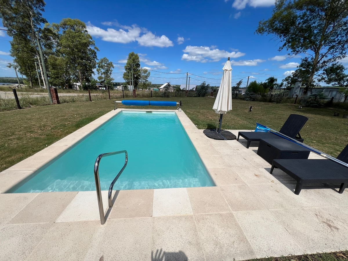 Bonita casa mobilada, com um amplo jardim e piscina aquecida na época (ppio de novembro a março). Tem dois quartos, Hab 1: cama de casal, Hab 2: beliche. Na sala de estar tem um sofá-cama quadrado e meio. Excelente para famílias, numa zona tranquila e natural. A 2 km da Playa Don Jesus e da cidade de Mercedes, Soriano. Forneça todos os confortos da sua estadia.