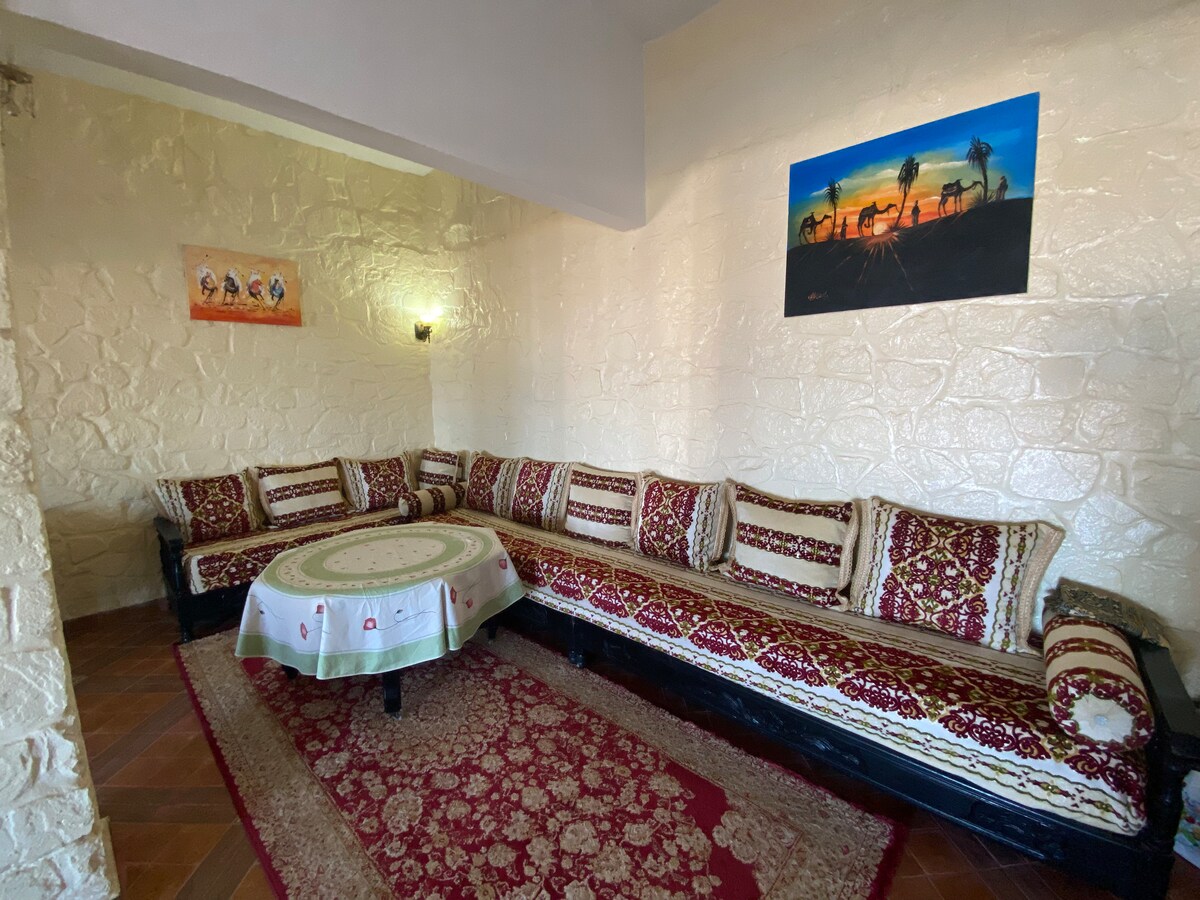 Este alojamento tranquilo e sossegado é o melhor lugar para relaxar longe do stress, com uma sala de estar clássica no rés-do-chão e uma segunda sala de estar no andar de cima com 2 quartos + WC e uma casa de banho com chuveiro de efeito chuva. Também oferecemos transporte ou transporte com motorista para até 4 hóspedes. Cidade Safi <=> a casa só de ida: 19 euros El Oualidia <=> a casa unidirecional: 55 euros Aeroporto de Marraquexe ou cidade , aeroporto essaouira ou cidade <=> a casa só de ida: 89 euros