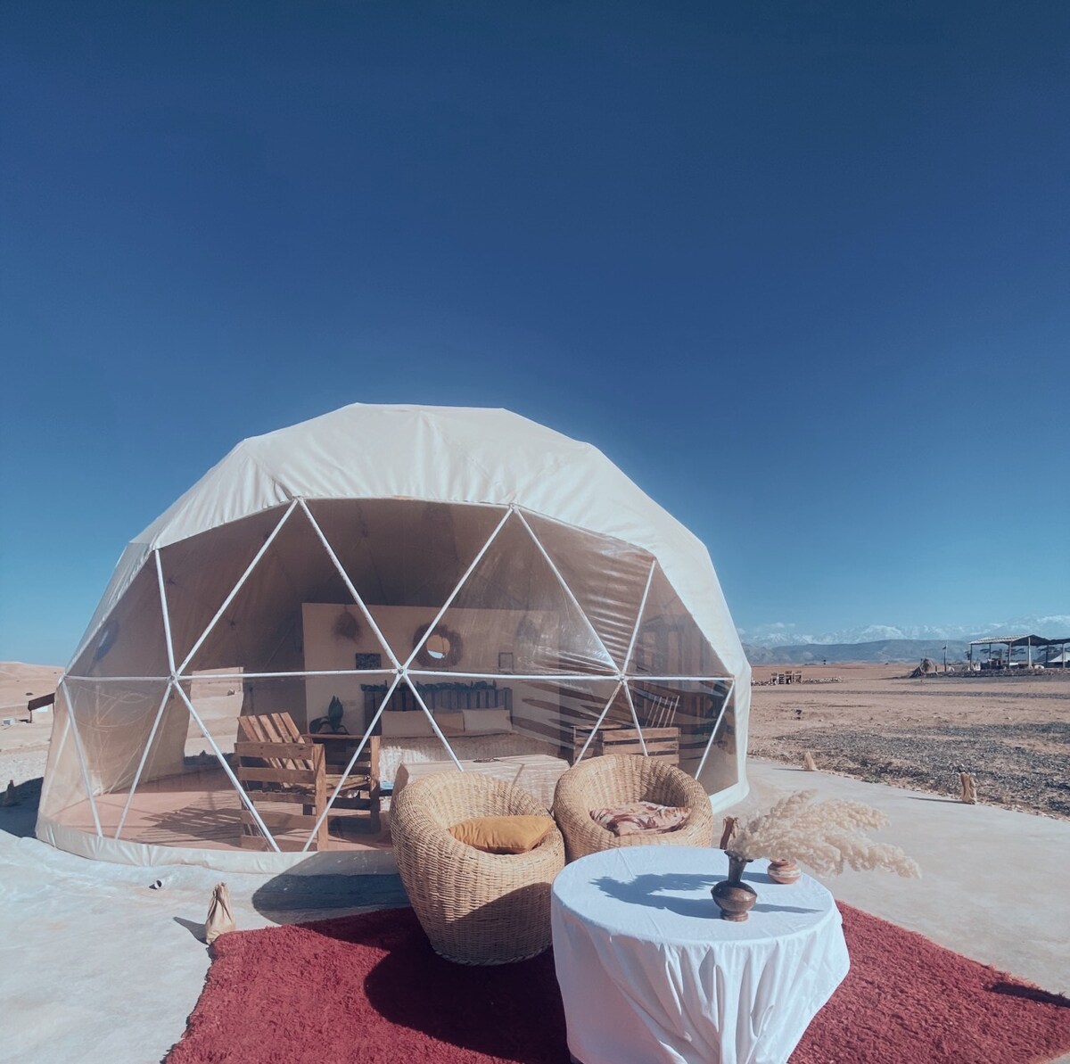 Vai adorar este lugar único na Cordilheira do Alto Atlas, no coração do Parque Nacional de Toubkal e a cerca de 1000 metros acima do nível do mar. Estadia ao ar livre nesta confortável cúpula Deluxe de 40 m2 com terraço privado e vistas panorâmicas. Equipado com uma cama king size e um quarto com 2 camas individuais, irá seduzi-lo com as suas muitas atividades em oferta: mountain bike, campo de ténis padel, caminhadas, caminhadas na montanha e subida do Mont Toubkal com guia.