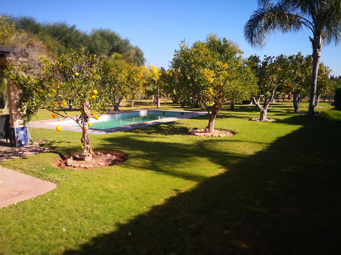 Linda moradia de 120 m2 de bela qualidade no domínio seguro 24/7 da Orangeraie em Dyar Shemsi. Muito bem equipado com 2 quartos, 2 casas de banho, 1 grande sala de estar/sam, cozinha com ilha central, aparelhos totalmente equipados e de alta qualidade. 2 TV, wi-fi, máquina de lavar roupa, máquina de osmose, amaciador de água, ar condicionado em todos os quartos, pátio, grandes terraços, piscina grande de 4x8m, churrasqueira, 3 fachadas, sem vista. Terreno fechado, ideal para donos de cães.