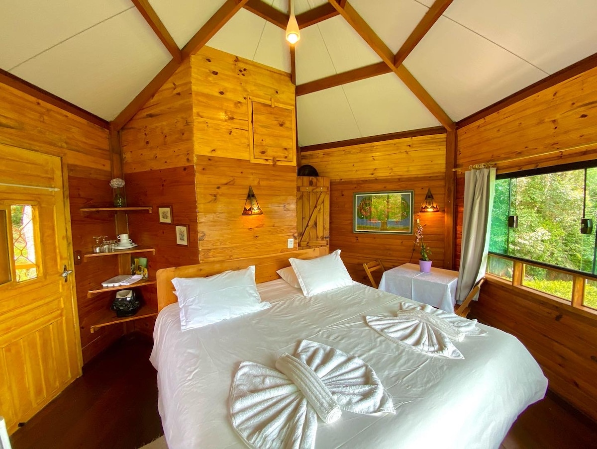 Um chalé na montanha em Santo Antônio do Pinhal, só para apaixonados. Sua arquitetura nos remete aos sonhos de infância, da casa na árvore. O máximo desse chalé, o ritual mágico, é fazer o banho de ofurô ao ar livre, de noite de preferência, para contar estrelas, à luz de velas, vaga-lumes ou luar ou a boa e velha lâmpada elétrica. Não incluímos enxoval de banho, mas podemos fornecer a parte. Animais de estimação são permitidos, porém, tarifamos à parte. Consulte sobre as tarifas.