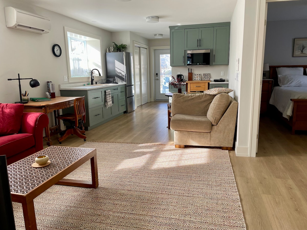 Welcome to this bright, clean, comfortable suite. Easily accessible from the ground level, entering from a lovely landscaped yard. This is the lower level of my home but completely separate, with your own private entrance around the back. There's a lovely bedroom with a comfy queen sized bed, a spotless bathroom with toiletries provided, a custom tiled shower, a living-room with a cozy couch, TV and a work desk, as well as an eat in kitchenette with breakfast supplies provided.