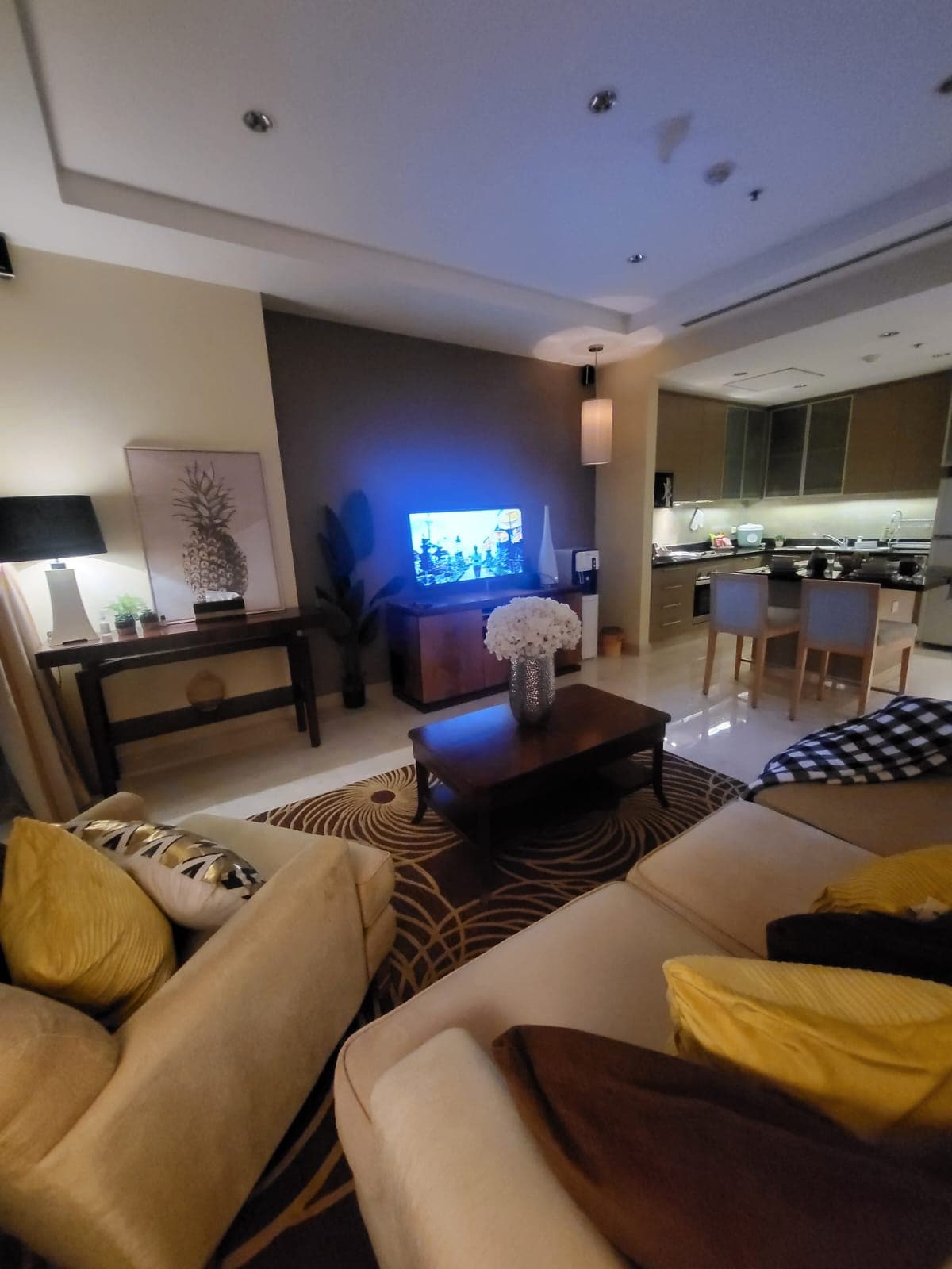 Apartment unit measuring 53m2 with two bedrooms. suitable for families or groups of 4 people. Smart TV and 30 Mbps internet access are available. Kitchen is available for cooking. Cutlery available. Bathroom with powerful hot shower. Very strategic location. Only 10' to Senayan City. Swimming pool, supermarket, ATM, paid parking available.