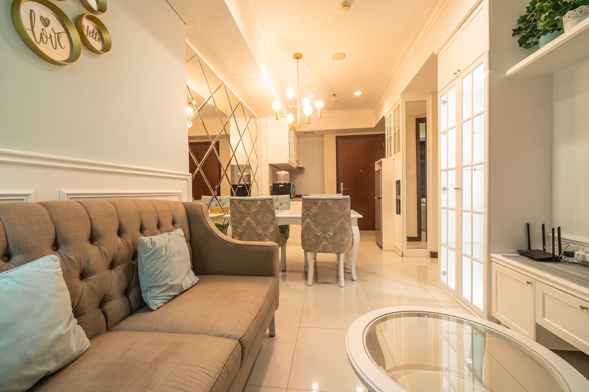 Um luxuoso apartamento de 2 quartos com uma combinação de interior clássico e moderno. O apartamento está localizado em um andar alto com uma excelente vista noturna da cidade de Jacarta. Também está conectado diretamente com um shopping center de primeira linha Kota Kasablanka, repleto de marcas de alto nível de lojas e restaurantes ou cafés. Os hóspedes terão acesso total à área de ginástica bem equipada e espaçosa, duas grandes piscinas, ótima área ao ar livre e também parque infantil.
