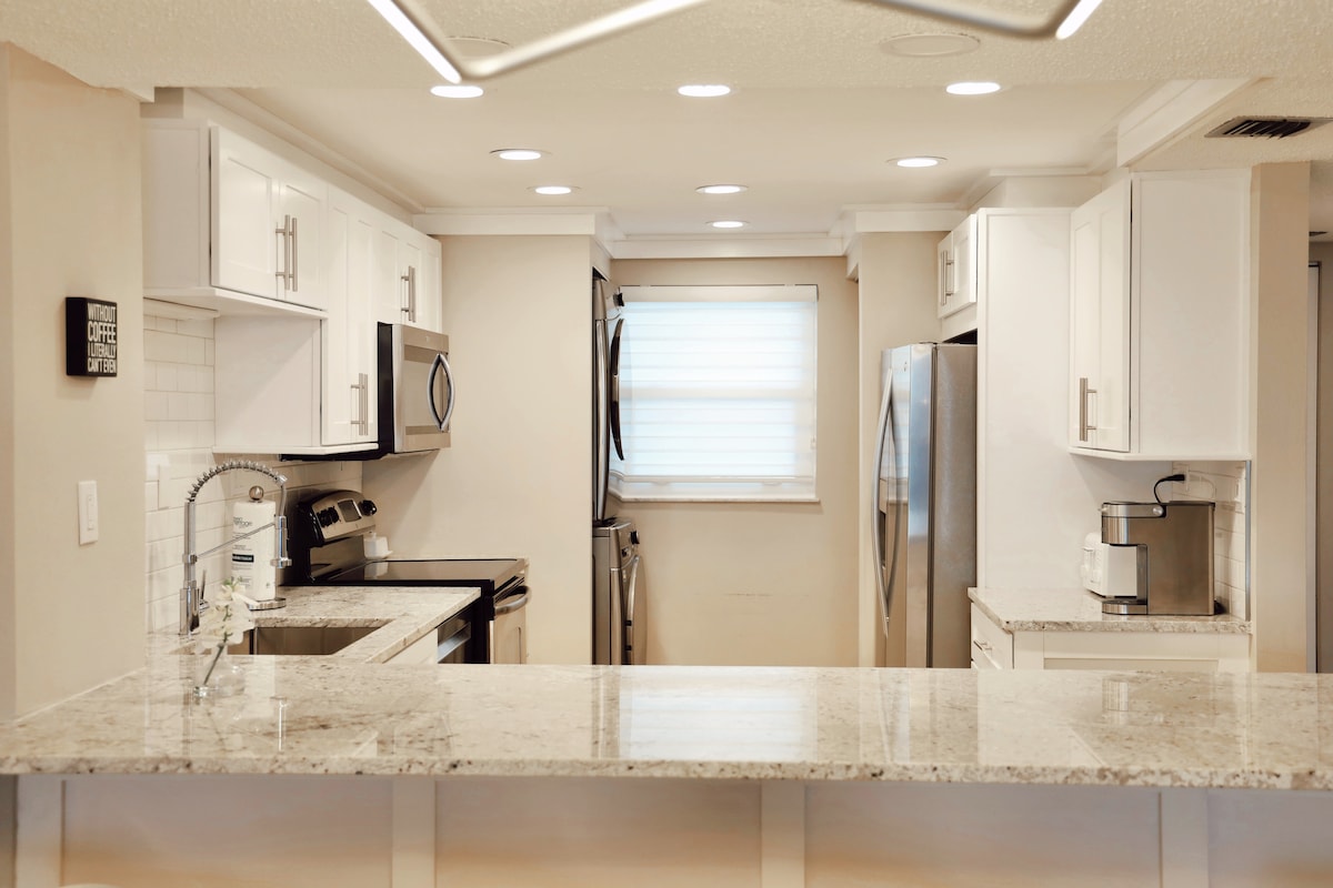 Esta é uma suíte de lua de mel recentemente reformada localizada diretamente em frente ao grande final de Siesta Key. É uma elegante unidade de piscina no térreo. Esta unidade está equipada com bancadas de mármore, olho de tigre, mesas de lapislázuli, ventilador de teto sem lâminas, iluminação de alabastro e TVs gigantes. Todos os aparelhos são inoxidáveis/inteligentes e o micro-ondas pode cozinhar bifes. Há uma academia. A localização geográfica na chave não pode ser superada! Há uma televisão flutuante sobre a cama de espuma de memória de luxo California King.