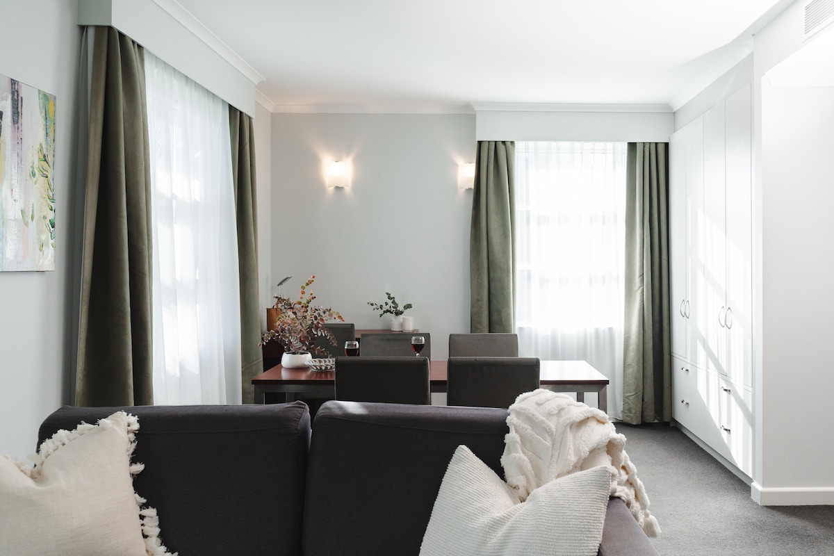 Uma residência requintada de 3 quartos com vista para jardins tranquilos e para a piscina na Capital Tower. Cada quarto inclui ar condicionado de ciclo reverso, uma grande Smart TV e a área de estar oferece uma barra de som premium para noites cinematográficas. Rodeado por arte selecionada e pisos de pastilhas elásticas, tem uma varanda ensolarada e uma atmosfera serena. Os hóspedes desfrutam de uma piscina aquecida, ginásio, sauna, campos de ténis e squash. Passeie até ao Lago Burley Griffin, aos restaurantes e galerias de NewActon, que oferecem as melhores experiências culturais e gastronómicas.