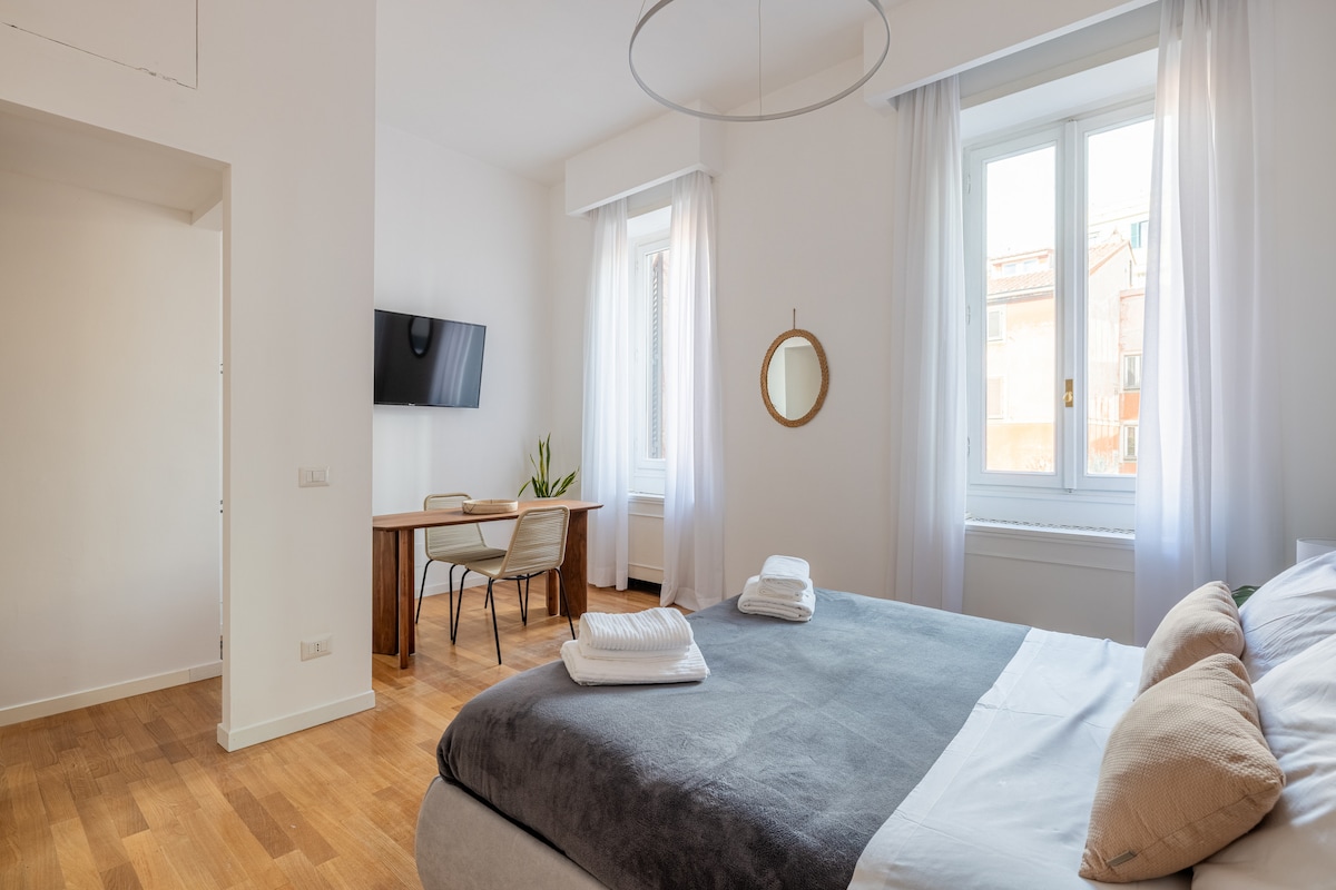 Mergulhe no esplendor da Roma clássica num apartamento elegante, recentemente renovado, tranquilo e muito luminoso no último andar para 4 pessoas. Serviço de concierge 24 horas, estacionamento pago disponível no edifício. A suite oferece todos os confortos que tornarão a sua estadia única: cozinha completa, colchões de espuma de memória, sofá-cama, 2 televisões inteligentes com Netflix e Amazon Prime, Wi-Fi e ar condicionado. O metro fica a um passo de distância e a estação Termini fica a 7 minutos a pé.