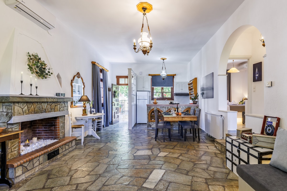 * Novos colchões 2025! * Casa de pedra antiga renovada de dois andares num terreno com uma vista deslumbrante para o mar Egeu, localizada na parte mais alta da aldeia tradicional de Zagora. Ótima escolha para famílias, grupos de amigos ou casais que procuram tranquilidade e conforto para as suas férias; seja no verão ou no inverno.