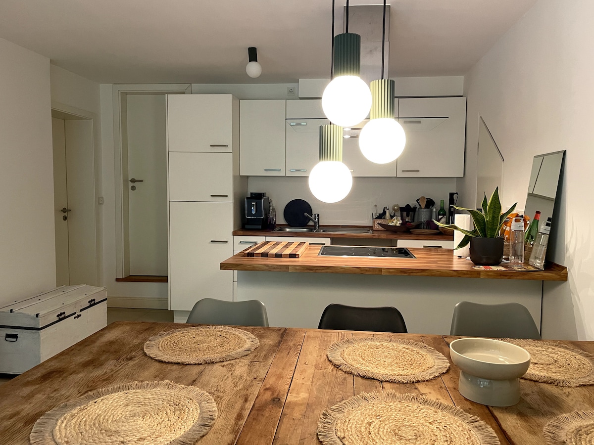 Bem-vindo à nossa casa! Atrás de nossa casa, um novo apartamento moderno espera por você, perfeito para relaxar e respirar fundo. Com uma cozinha de verão para suas aventuras culinárias, um chuveiro elegante e um quarto aberto com uma cama de casal aconchegante (1,60 x 2,00 m), você está bem equipado. O terraço de madeira privado no campo convida para cafés matinais relaxantes e noites aconchegantes com vinho. O melhor? Você tem o apartamento inteiro para você - sem estresse, apenas paz e tranquilidade!