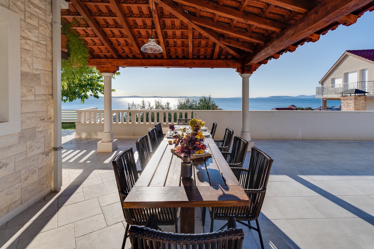 Villa Olea, with very modern and practical interiors, well-organized 4-bedroom villa with panoramic sea and island views from the whole property can welcome groups of up to 8 people. It is perfect for families, friends, and couples. This beautifully appointed property in Podstrana is nestled 1km above the coastal road on a 500sqm private plot, offering a 150sqm of useful interior space spread over 2 floors (ground floor and first floor).