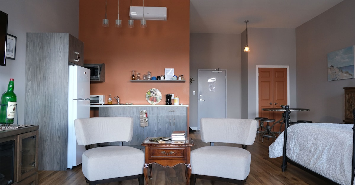 Localizado na rua West histórica, no centro de Port Colborne. Nosso maior apartamento estúdio com 2 camas queen size e um sofá king pull out. Cozinha acoplada com banheiro privativo. Smart TV com Wi-Fi. Perto de todas as comodidades locais, incluindo praia, marina, museu e muitas lojas e restaurantes. Deixe seu carro em casa e aproveite a sensação da costa leste do Porto. Sem vista para o canal do quarto