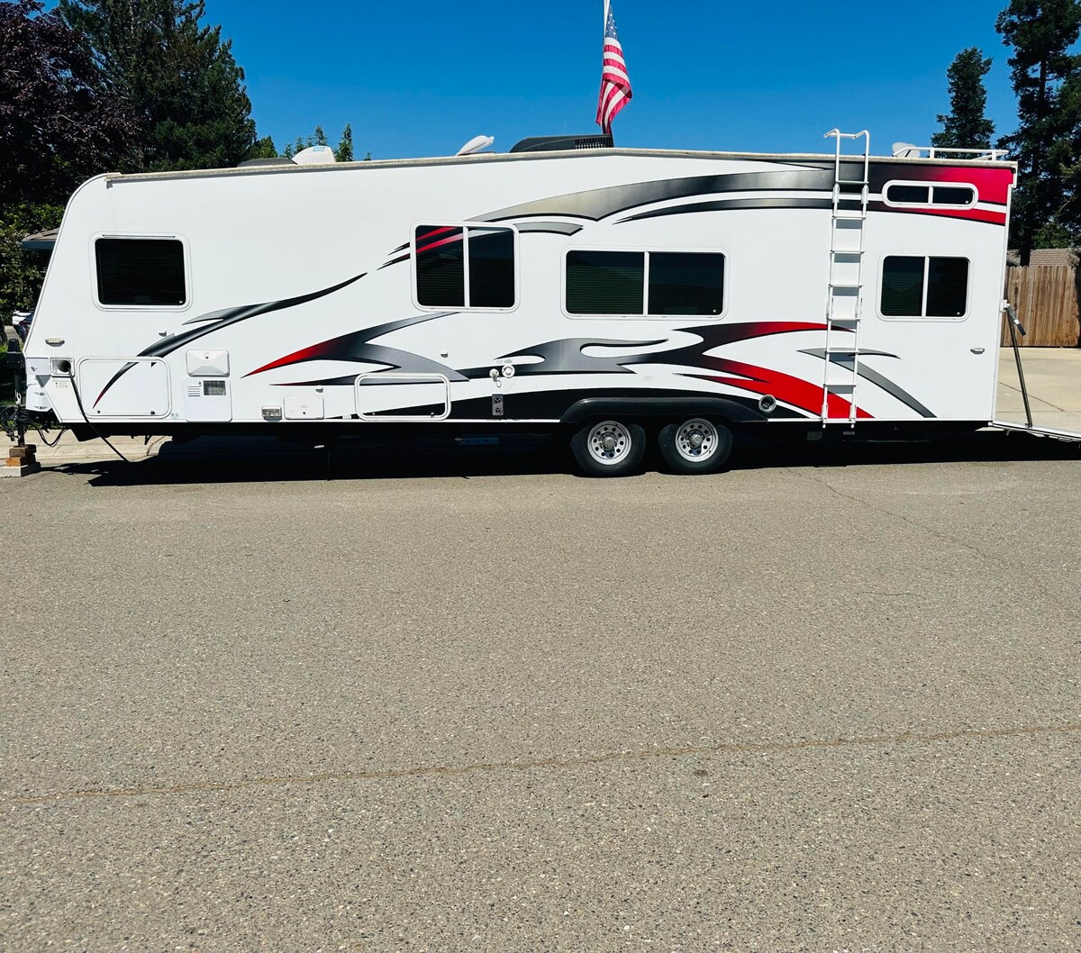 Create your next family adventure in this new Toyhauler. Enjoy sitting on the outside patio area. RV can comfortably sleep 5-7 This RV offers an AC and heating unit, ceiling fan, TV with lots of DVDs, BBQ, outside chairs and table, full propane tanks, and full water if dry camping. Additional pricing: $100.00 delivery/pick-up fee within 100 miles of 95360. No guest towing allowed. $200.00 refundable security deposit $100.00 non-refundable cleaning deposit