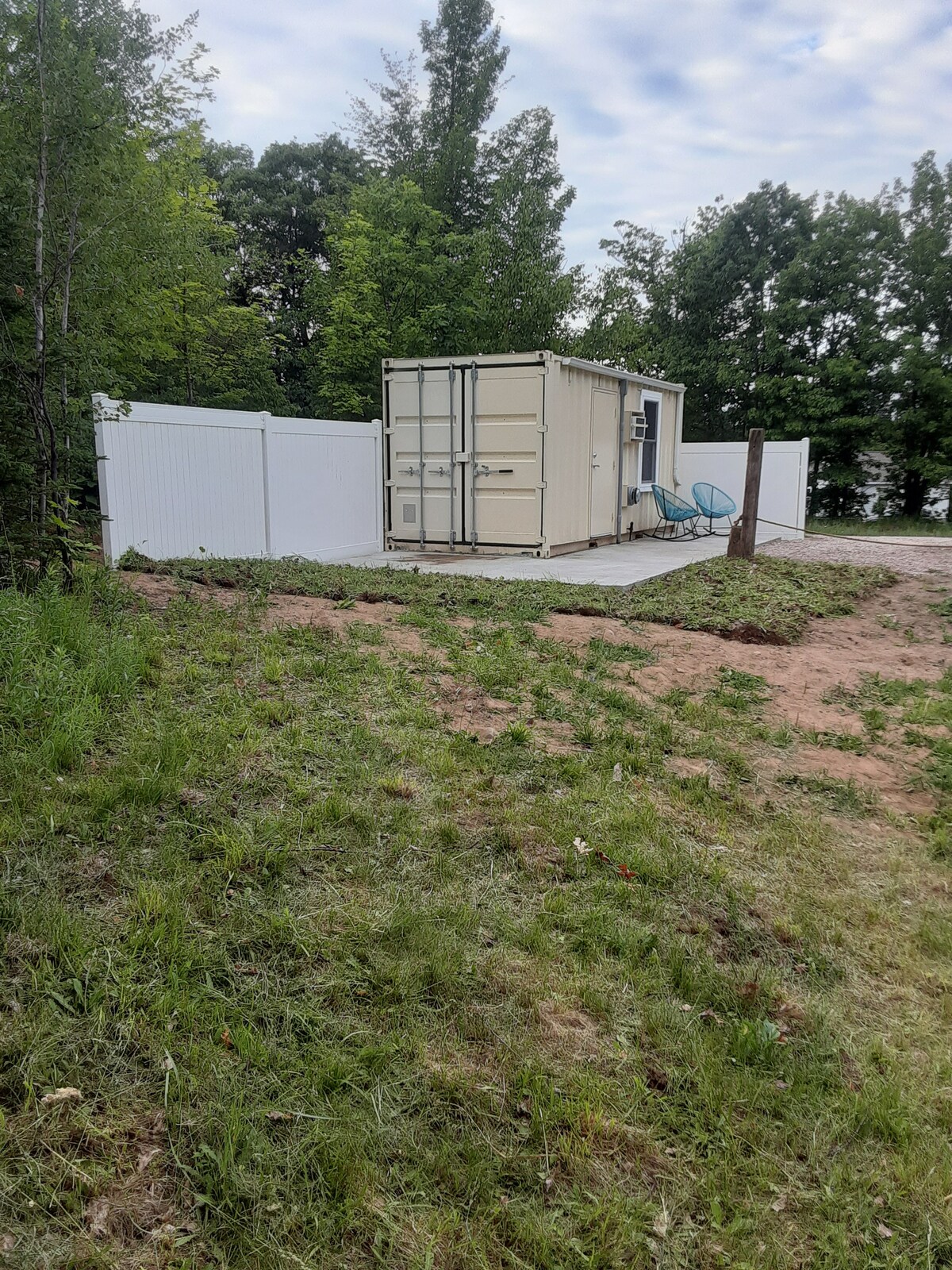 Baixa taxa mensal. Contêiner de transporte pequeno e aconchegante de 20 pés com pátio de concreto a 3 milhas de Houghton. Espaço para sentar ao ar livre. Muitas vagas de estacionamento. Combinação de geladeira e freezer pequeno. Forno pequeno serve para pizza de 12 polegadas. Cafeteira Keurig, K-Cups fornecidos. Placa quente de 2 bocas. Banheiro 3/4. Puxe para baixo a cama retrátil de tamanho COMPLETO (NÃO Queen) com mesa anexada quando estiver para cima. Panelas, frigideiras, talheres, pratos e copos fornecidos. Boa água potável da torneira. Roupa de cama e toalhas fornecidas. Wi-Fi e smart TV. SEM operadora de TV.