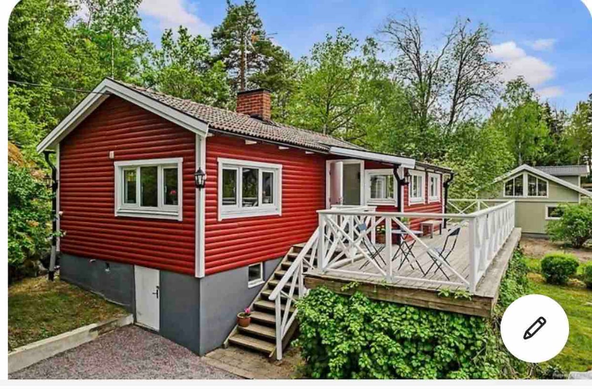 Casa de hóspedes aconchegante localizada a apenas 30 metros do lago Återvallssjön e com a natureza ao seu redor. A casa tem um lindo terraço com área para churrasco e vista para o lago. Perfeito para dois, mas também pode ser providenciado um lugar extra para uma criança. Aqui você vive bem, perto do lago, do mar, do golfe e do arquipélago. O ponto de ônibus fica a 200 m da cabana, que leva você a Estocolmo/Slussen.