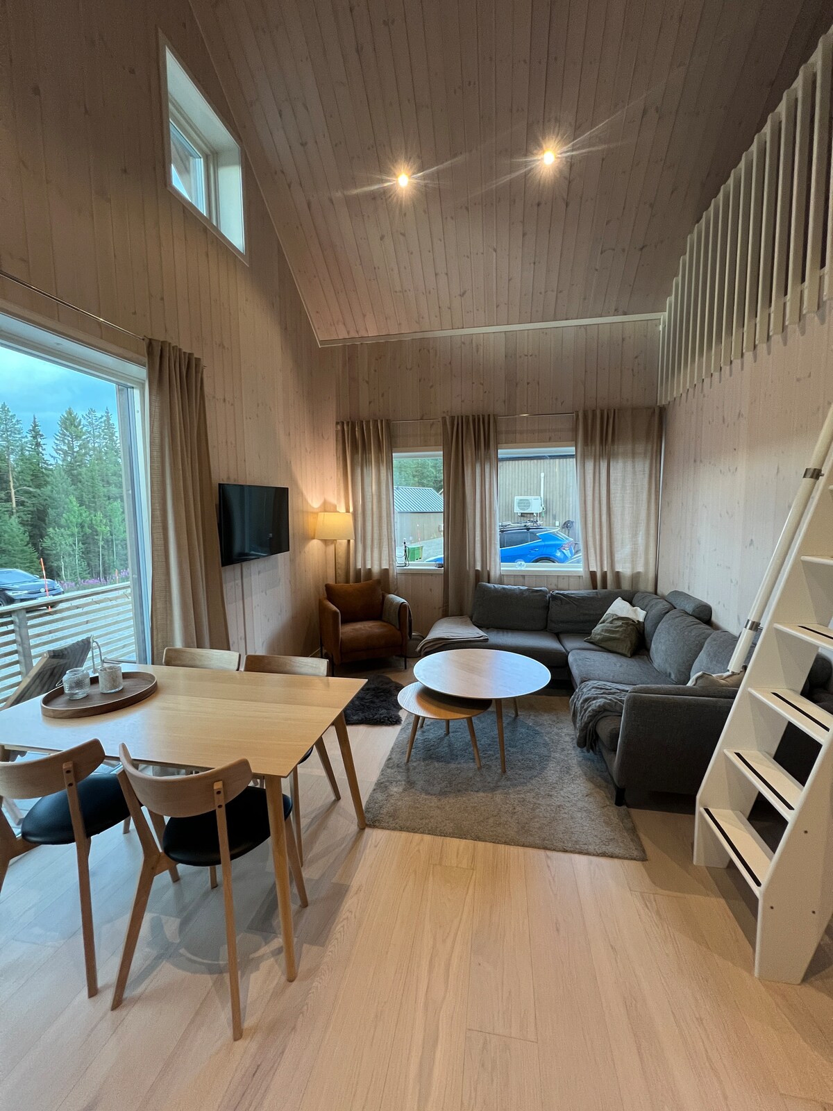 Chalé mágico em local tranquilo, perto de trilhas para caminhadas e com distância de deslizamento para esquiar em pistas e trilhas. Depois de um dia nas montanhas, você pode entrar para um sauna, relaxar no sofá em frente à lareira ou desfrutar de um jantar em torno da grande mesa de jantar em frente às paredes de vidro que emolduram o ambiente da montanha como uma grande pintura. O chalé localizado perto de Storhogna M, onde há um restaurante, aluguel de esqui, mercearia self-service e boliche. A 2 km de distância, há um hotel de montanha com spa e mais restaurantes.