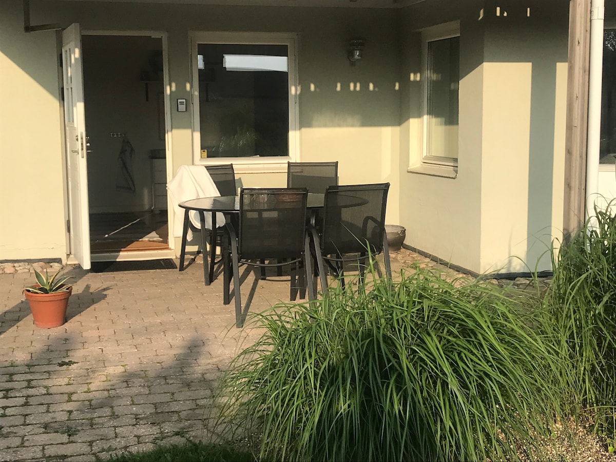Na parte inferior do nosso belo jardim, fica o nosso anexo acolhedor, que você tem para si mesmo. O anexo foi recentemente renovado em um estilo charmoso e aconchegante. Há uma cozinha onde é possível fazer o café da manhã. Se você quiser fazer comida quente, escolha outro AirBnB. O anexo está perto da floresta e da praia. O anexo está localizado a 1 km do centro da cidade e a 1,5 km do mercado de alimentos, estação e Kronborg.