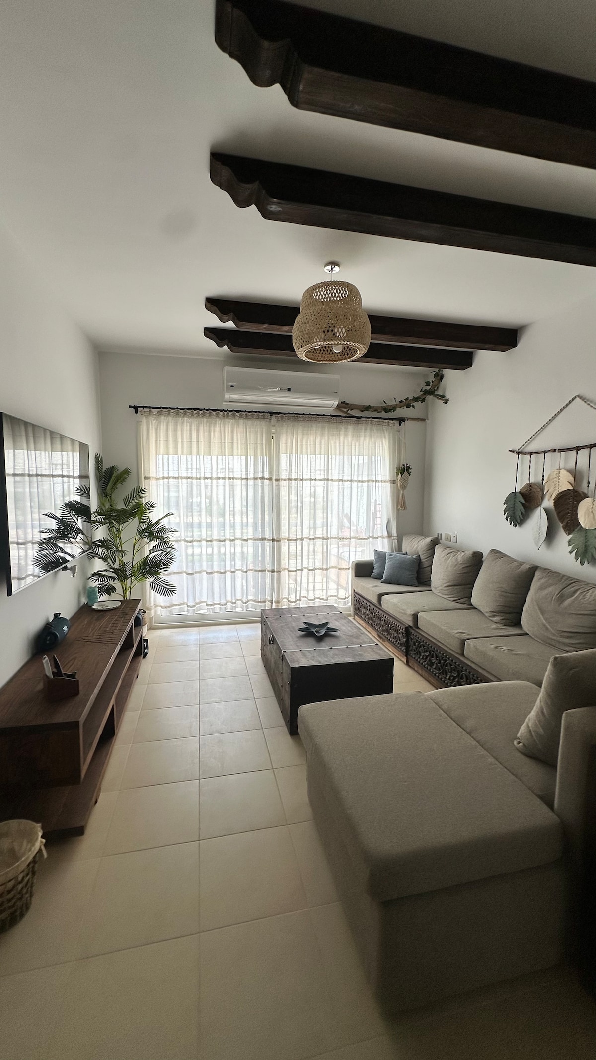 Chalet (3) quartos (2) casas de banho, receção, sala de jantar, cozinha completa O chalé fica no primeiro andar superior, a distância do chalé ao mar é de (6) minutos a pé, pode ir de carro para poupar tempo, o chalé tem dois quartos e uma receção, ar condicionado, controlo inteligente: através do sistema Alexa, pode controlar a iluminação, o ar condicionado e os aparelhos elétricos com comandos de voz simples. Defina o modo de iluminação apropriado para a sua noite com uma palavra. Há acesso Wi-Fi gratuito, eletrodomésticos, um frigorífico de 390 litros, um fogão a gás natural de 4 bocas, uma máquina de lavar roupa superautomática de 8 quilos, uma televisão de ecrã plano de 55 polegadas e um aquecedor elétrico.