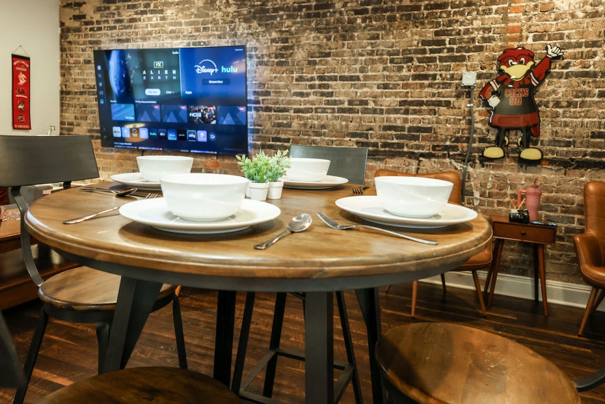 Esta encantadora casa de tijolos de 3 quartos e 2 banheiros apresenta uma cozinha moderna com bancadas de granito e eletrodomésticos de aço inoxidável. O grande espaço do quintal é totalmente cercado, com um grande deck, churrasqueira a carvão e lareira. O espaçoso quarto principal tem um banheiro privativo e um grande closet. O quarto principal e a sala de estar têm Smart TVs. Entre nas suas próprias contas de streaming ou aproveite a conta Hulu gratuita. A planta dividida permite uma fácil separação dos hóspedes.