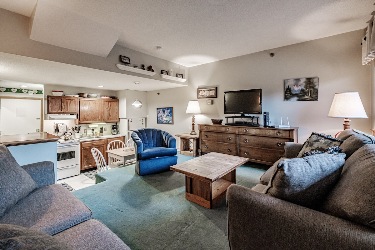 This two-floor ideally located condo is on the mountain between Barker and White Cap Lodges. You can ski in/out using Roadrunner trail, which is right across the parking lot. There is plenty of parking and the condo is located in Building 2, which is closest to the common lodge area with a fireplace and pool/hot tub/sauna access. While this is technically a 1 br, there is a wall between the queen room and the full/twin room for privacy, and a queen size murphy cabinet bed in the living room.