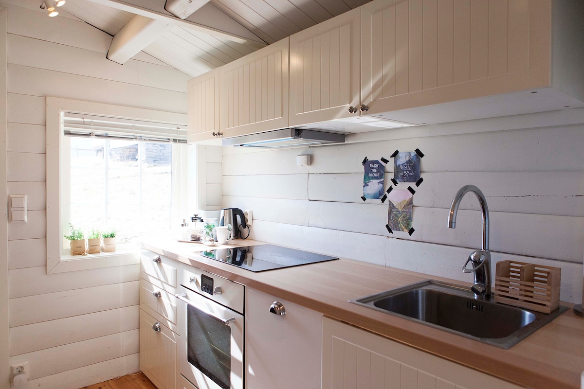 Cabana com vista fantástica em ambiente tranquilo. Curta distância até o fiorde e um barco a remo está disponível durante o verão. A cabana tem uma mini cozinha, geladeira, um pequeno forno e microondas. Sem máquina de lavar louça. Banheiro com chuveiro e vaso sanitário, cabos de aquecimento no chão. Sala de estar com sofás, mesa de jantar e uma lareira aconchegante. Os quartos são muito pequenos. Varanda coberta com móveis de exterior. Roupa de cama e toalhas não estão incluídas. Quando nevar, você deve estacionar na estrada e caminhar os últimos 50 m até a cabana. Estacionamento na cabana durante o verão.