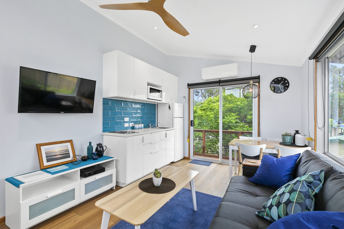 Nosso novo apartamento construído para fins específicos é iluminado e leve com acessórios elegantes e decoração confortável. Com um quarto grande com cama queen size e banheiro adjacente, cozinha bem equipada e área de estar, além de varanda privativa com churrasqueira e vista para o jardim dos fundos. TV Foxtel, aquecimento e resfriamento em ambos os quartos. Há um acesso separado ao apartamento para todos os nossos hóspedes. Nosso espaço está localizado no centro da cidade e a apenas 2 minutos a pé das principais lojas, cafés, hotel, rio Anglesea e parques.