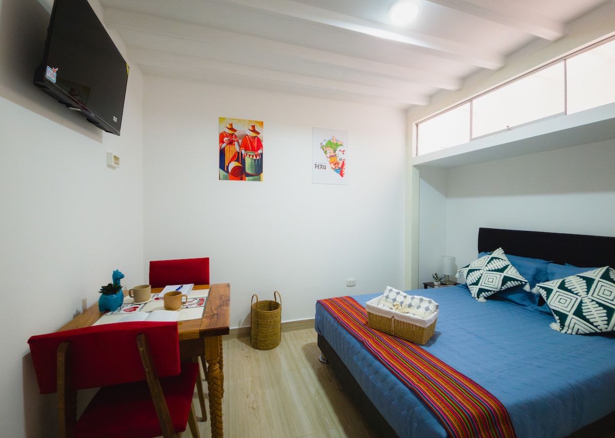 Apartamento super bem localizado em Surquillo, perto de bairros como Miraflores, San Isidro, San Borja e Surco, perto de shoppings e grandes avenidas, ideal para famílias, pois tem 1 quarto com TV de 55" com cama queen size, sofá-cama, banheiro completo, cozinha americana, sala com TV de 86" e tudo o que você precisa para uma boa estadia, 10º andar. Possui uma área comum com churrasqueiras, sala de bilhar, academia, cinema, lavanderia industrial, área de churrasqueiras (pagamento prévio).